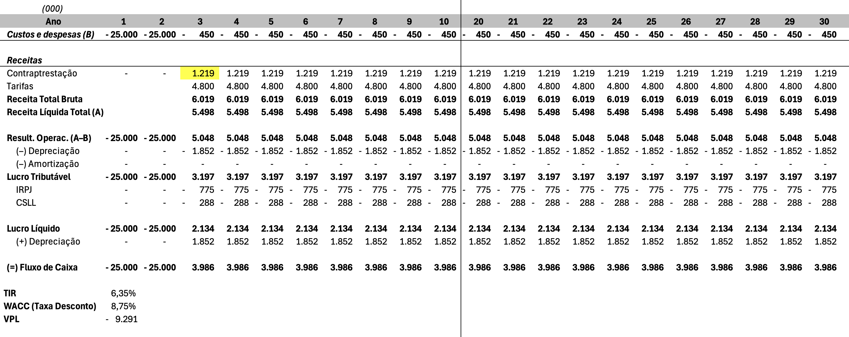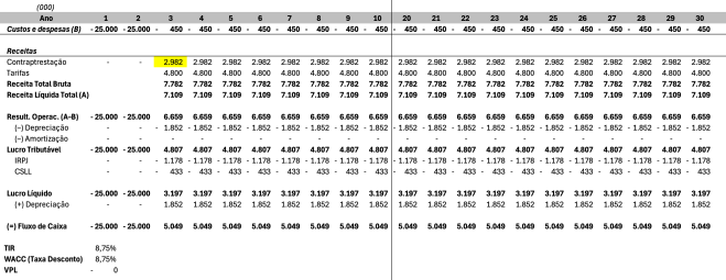 Manterei a Amortização zerada por enquanto, apenas para facilitar o entendimento. Futuramente voltarei ao assunto e complementarei o exemplo. Também considerarei a depreciação total do ativo de 50 milhões (investimento em CAPEX) linear durante o período exato da concessão, para simplificar.