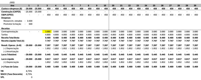Ou seja, é um conjunto grande de tarefas coordenadas que demandam a atuação de profissionais e especialistas com conhecimentos específicos. Isso tem um custo elevado, e costuma tomar vários meses de desenvolvimento mútuo com a participação de servidores públicos que conheçam a fundo as realidades e desafios locais. Este custo de estruturação do projeto costuma ser ressarcido aos cofres de quem o financiou (que pode ser o próprio poder público concedente ou um fundo estruturador) pelo vencedor da licitação. Dessa forma, no primeiro período da concessão, adicionamos essa despesa pontual da concessionária.