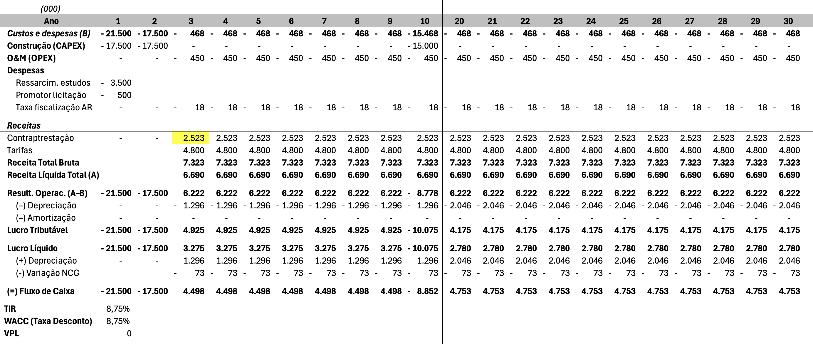 Vejamos como isso aconteceria em nosso caso, uma concessão patrocinada, supondo uma hipotética cobrança equivalente a 0,25% da Receita Bruta da concessionária (já aplicado o Atingir Meta para VPL = 0):