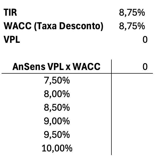 Pronto, você verá os resultados de VPL possíveis, para esta receita do concessionário, ceteris paribus, caso o custo de capital total do projeto (WACC) flutue nesses parâmetros testados. Veja como fica o resultado na imagem abaixo: